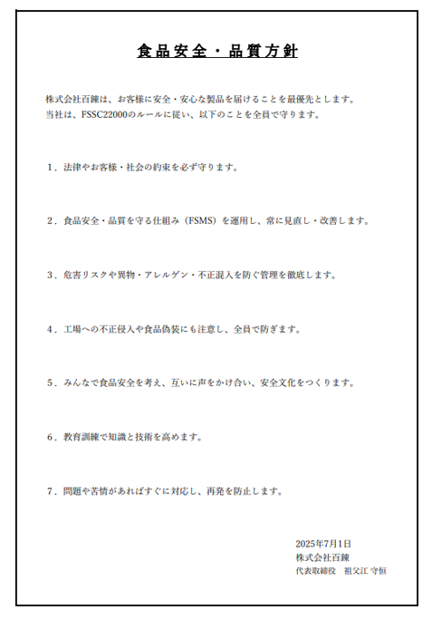 株式会社百錬は安全安心な商品を供給し続けることを念頭にお客様とともに繁栄を願う福岡の飲料製造メーカーです。